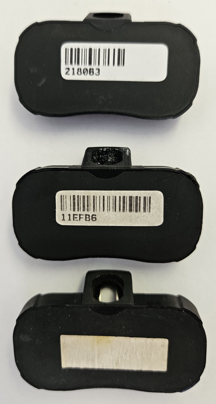 BOTTOM: Sensor exposed to liquid/moisture. Barcode will be faint or not visible at all. Barcode sticker wrinkled up. Normally occurs when: liquid or moisture is introduced during fitment (incorrect installation, incorrect use of bead lube), using faulty compressors or compressors without water trap and filling the tyre with water, or when using tyre sealant. Moisture can also enter the rim when driving at low pressures on the beach. Please take care as warranty will be voided if the barcode does not look like the sensor in the middle or top when doing a warranty claim.